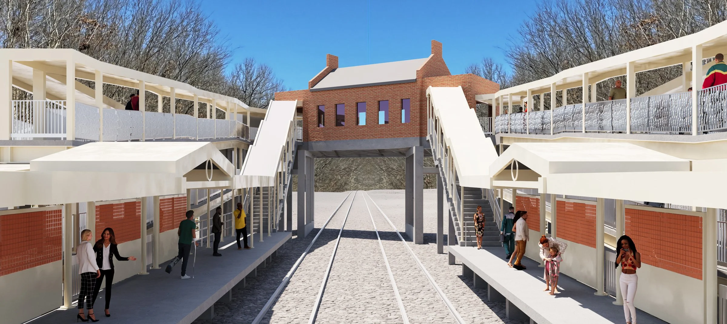 As you walk down the stairs, the faces are moving above you. They’re facing forward, going to the city or facing home when you return. On the ramp the faces face away from you. They’re indented as if you could put your face there.