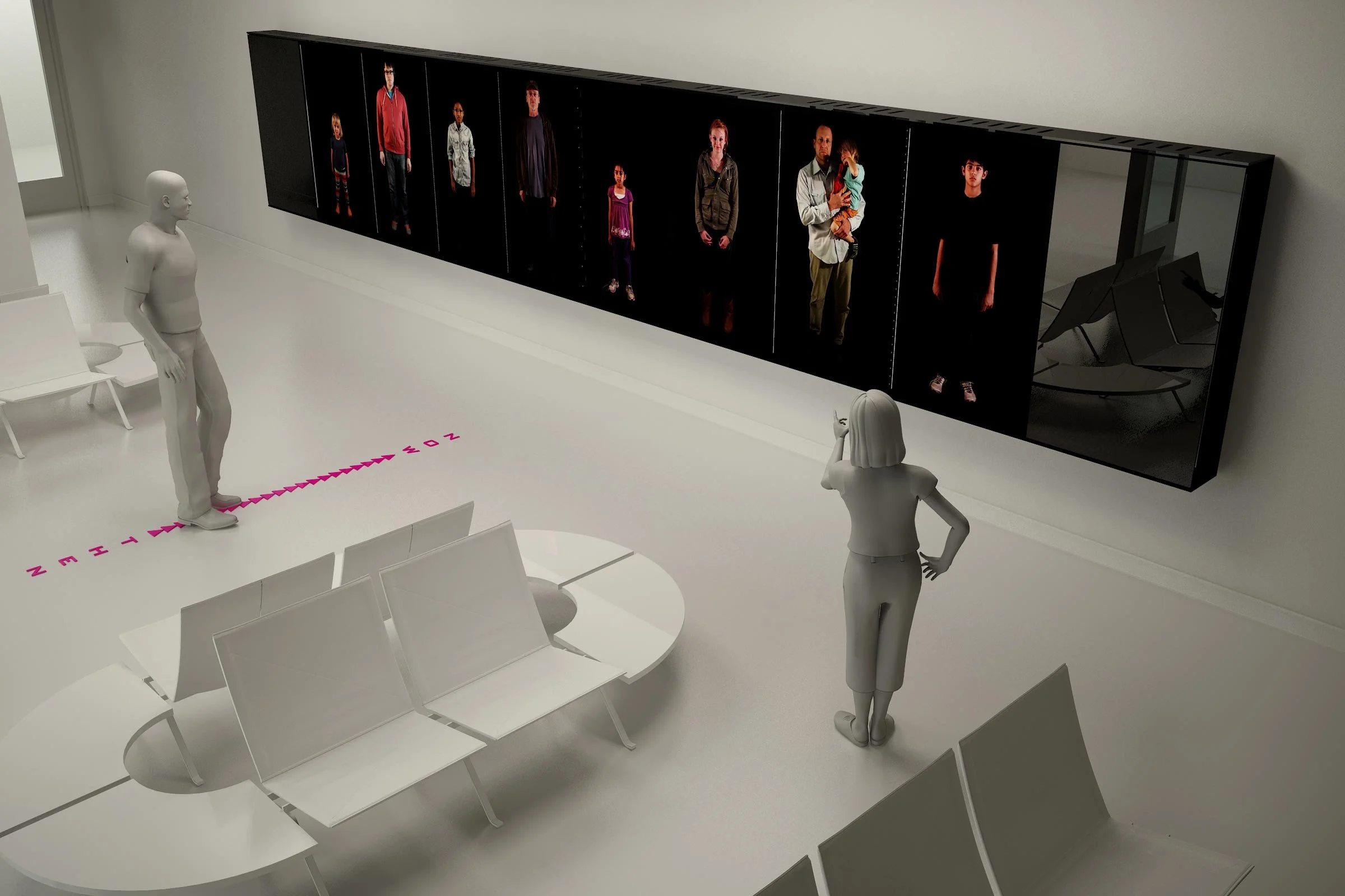 In Now : Then, visitors to the hospital can record brief full body video clips of themselves that will be added to the piece over time. These clips are recorded whenever someone steps into a specially illuminated alcove and stands still. The videos are recorded and date stamped to be called up later.